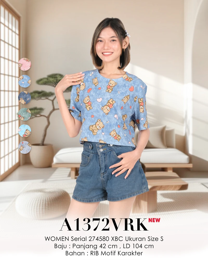 Material produk terbuat dari rib motif karakter. Disarankan pencucian dengan perlakuan lembut. Tidak disarankan mencuci dengan air panas.