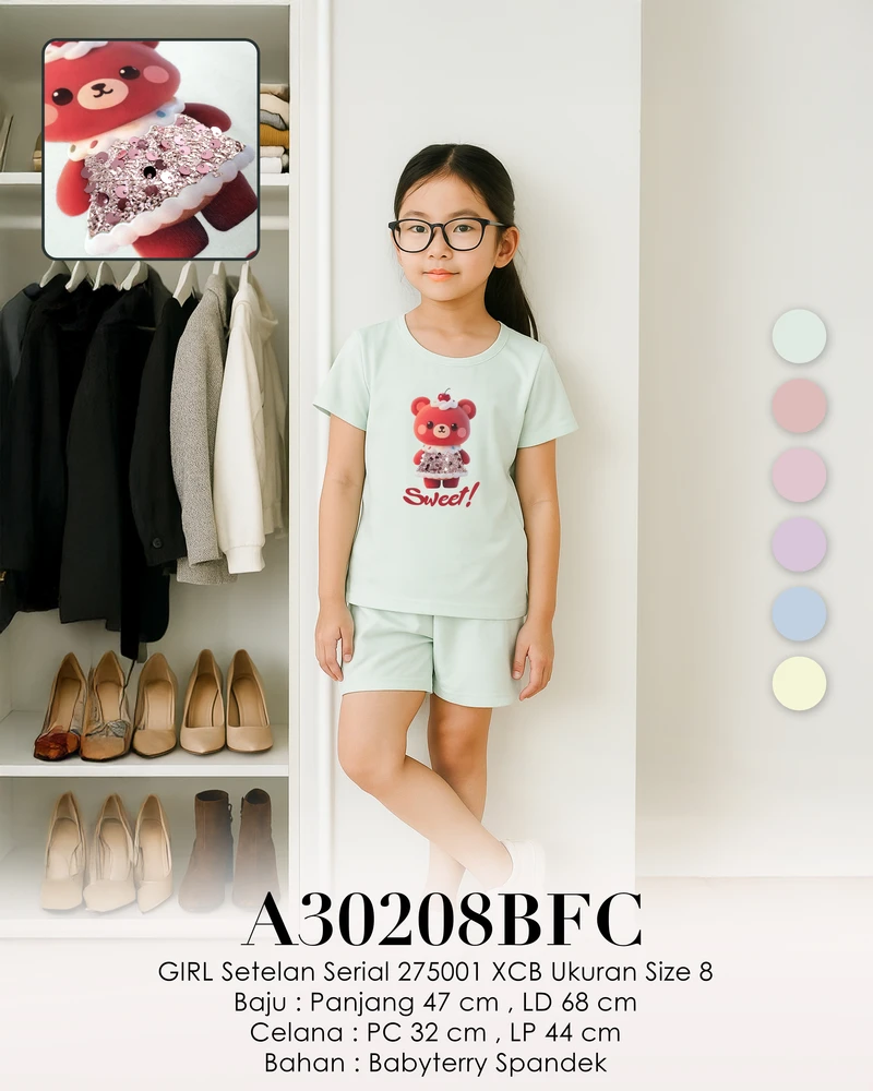 Material produk terbuat dari Babyterry Spandek. Disarankan pencucian dengan perlakuan lembut. Tidak disarankan mencuci dengan air panas.