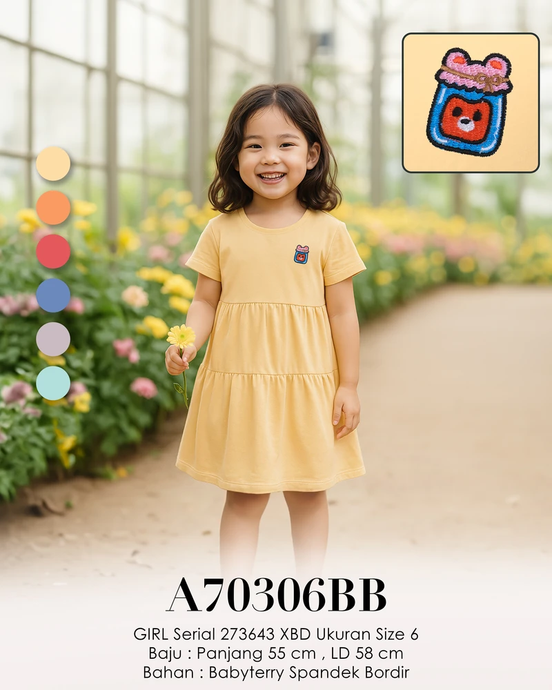 Material produk terbuat dari babyterry spandek bordir. Disarankan pencucian dengan perlakuan lembut. Tidak disarankan mencuci dengan air panas.